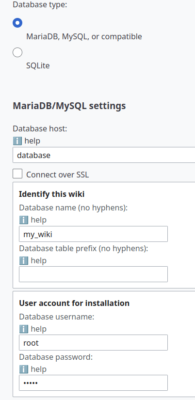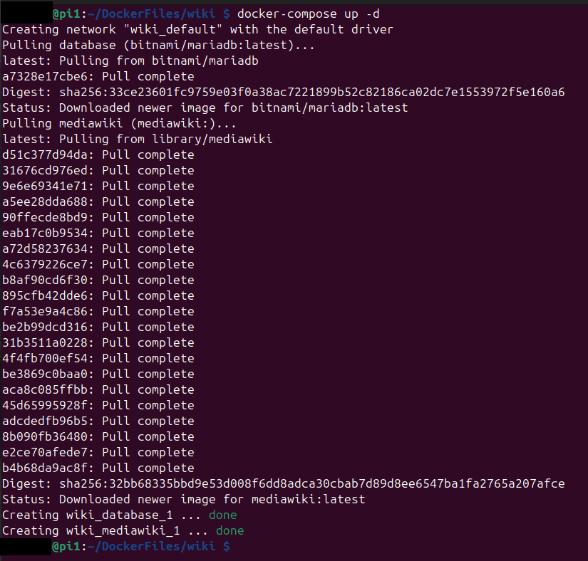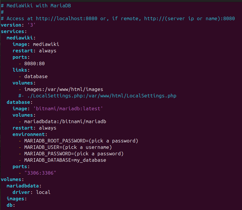 I found it difficult to find a configuration that works almost out of the box with MediaWiki and any supported database (SQLLite, MariaDB, MySQL, Postgress)in Docker on a Raspberry Pi. I hope this helps you compose and configure a basic MediaWiki site with a MariaDB back-end. This guide assumes you have Docker and Docker Compose installed on Raspberry Pi OS with a known username and password. Anything in parentheses should be replaced with your own string/variable/integer.