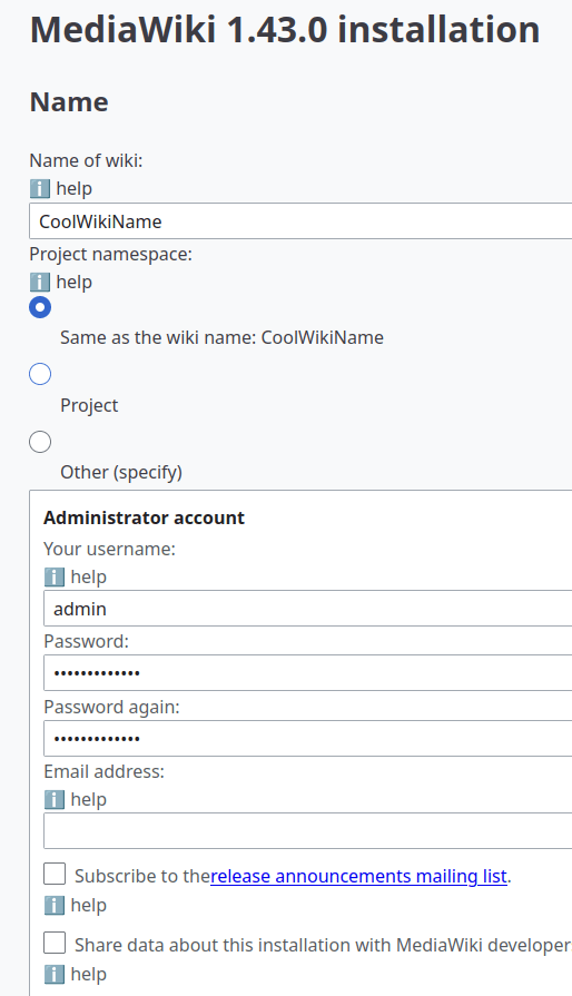 - If you go with “Ask me more questions”, you’ll be given additional options like what type or wiki you want it to be, theme options, plugin options etc. This guide does not cover the installation of additional plugins, click these at your own peril.